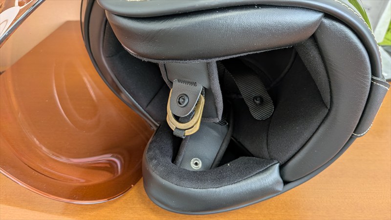 キタコ・キジマのバックル共通の問題だけど、あごひもを通す部分が狭い。