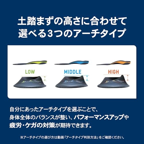 土踏まずの高さが3段階で選べるのも良い。オーダーメイド感覚のインソールを手に入れることが出来ます。自分の土踏まずが高いのか低いのかは難しい。そのため最初は中間を選んで置くと外れない。