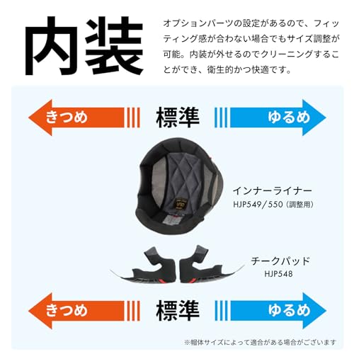 インナーサンシェード、インカム取付スペース、紫外線・赤外線カットシールド、マイクロラチェットバックル。