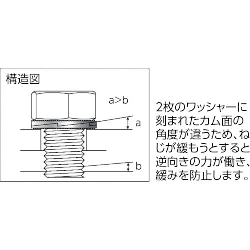 母材に段差を食い込ませたり、座金同士の段差を組み合わせることで、回転による緩みを防止します。