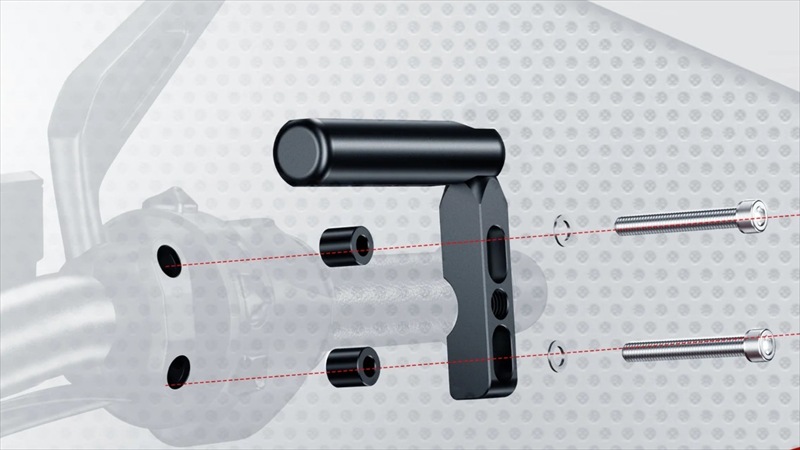 - 2本のボルトによってマスターシリンダーと一体化した支柱で、クランプバーが支えられることになる。このため、ガッチリと固定されるのでスマホホルダが走行中に振動し難い